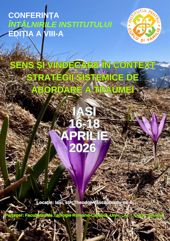 Institutul pentru Cuplu și Familie vă invită la a VIII-a ediție a Conferinței Întâlnirile Institutului, cu tema „Sens și vindecare în context . Strategii sistemice de abordare a traumei”, în perioada 16-18 aprilie 2026, care se va desfășura în Iași și va aduna specialiști în domeniul psihoterapiei. Conferința va fi acreditată la Colegiul Psihologilor din România, participanții urmând să obțină credite de educație continuă.